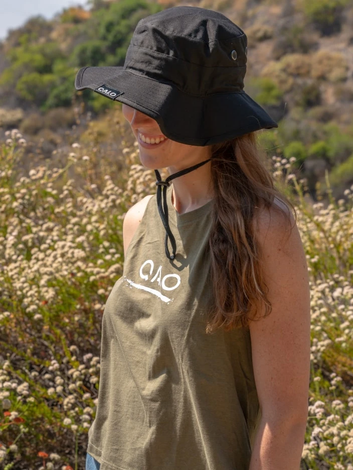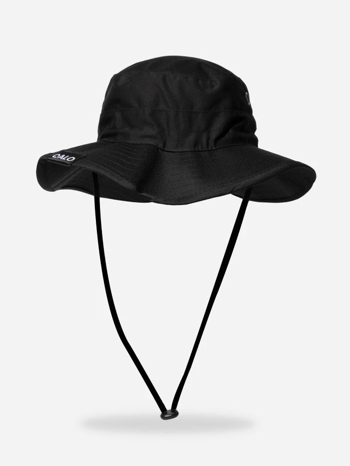 The QALO Bucket hat features 4 screened side vents, loops woven into the sides, and an adjustable chin strap. Made from a poly/cotton material.