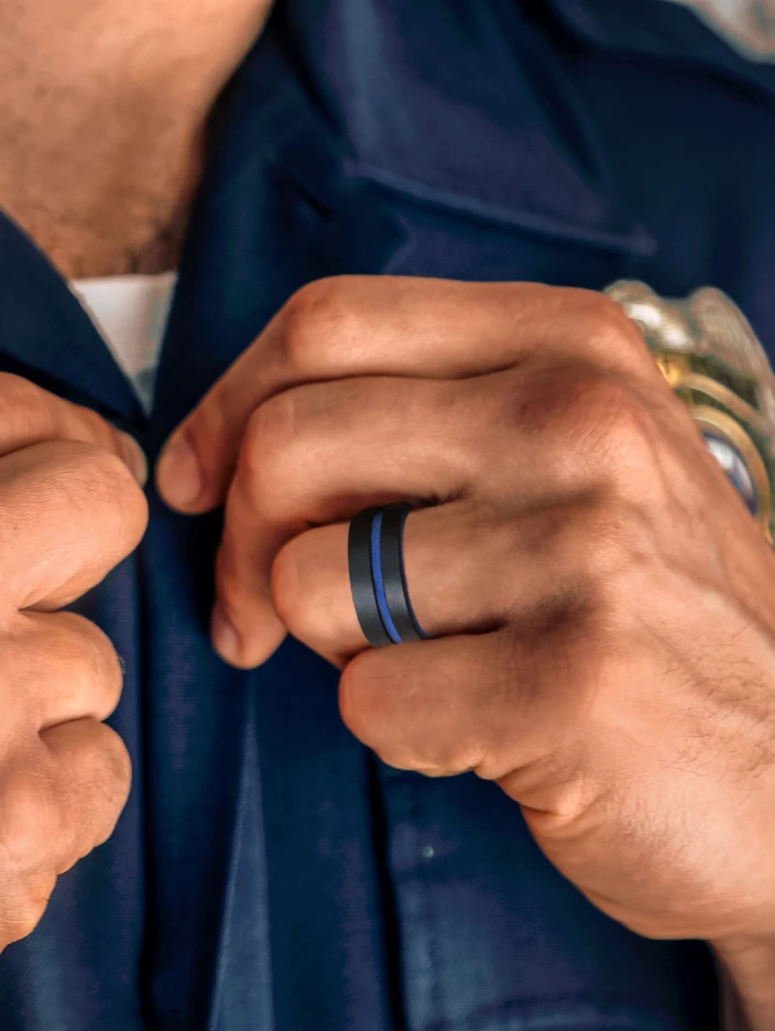 This black and navy multi-layered ring is perfect for police officers and the people who love them. Crafted from premium quality silicone, this ring provides on-trend style, frictionless wear, and complete comfort.