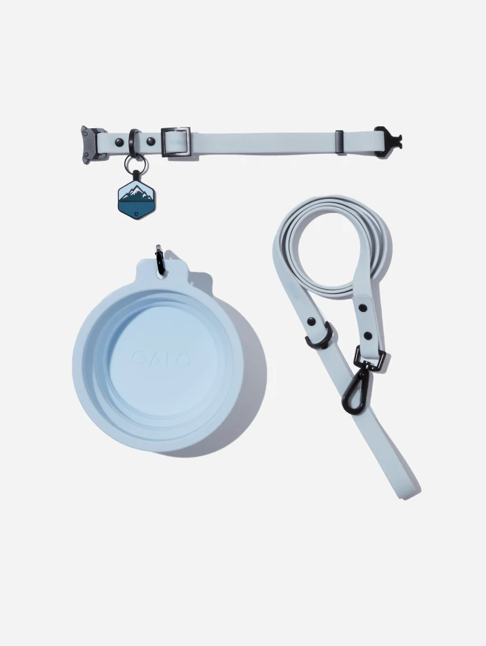 Sky Blue QALO Leash & Collar & Frost Mountain Silicone Dog ID Tag Set