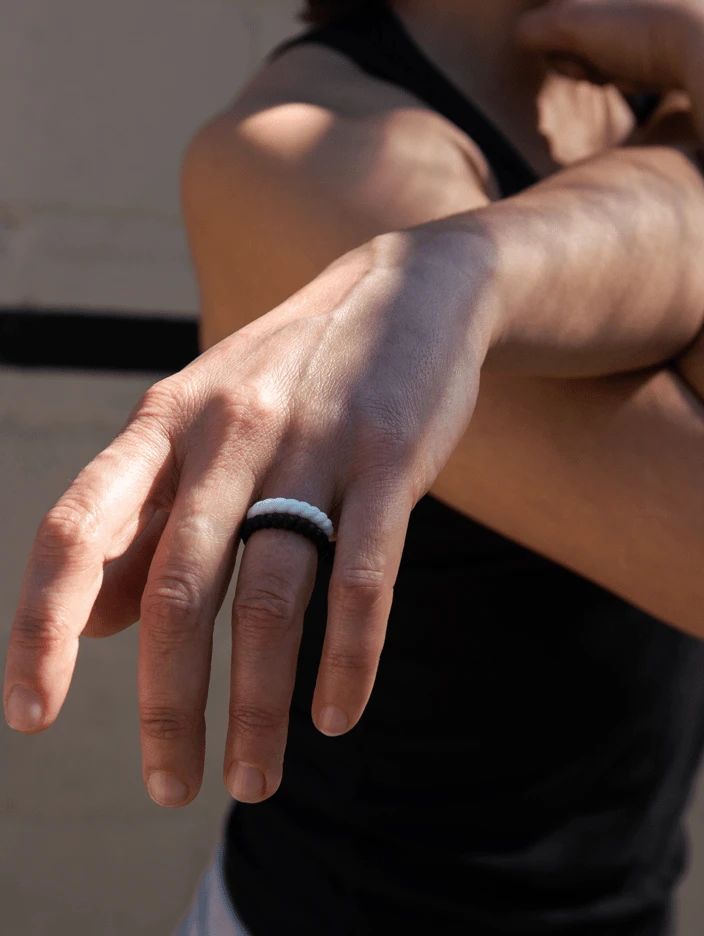 This silicone ring gift set includes a Unisex Marble Modern Silicone Ring, Women’s Strata Black and Aqua Arrow Silicone Ring, Women’s White Quartz Twist Stackable Silicone Ring and a Women’s Jet Black Geo Stackable Silicone Ring.