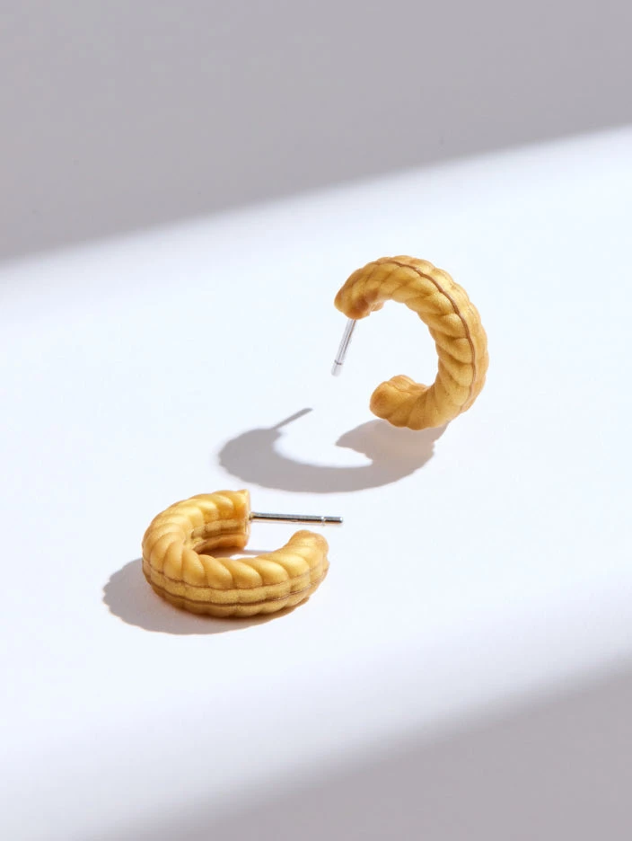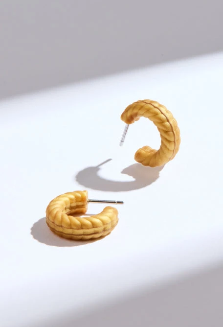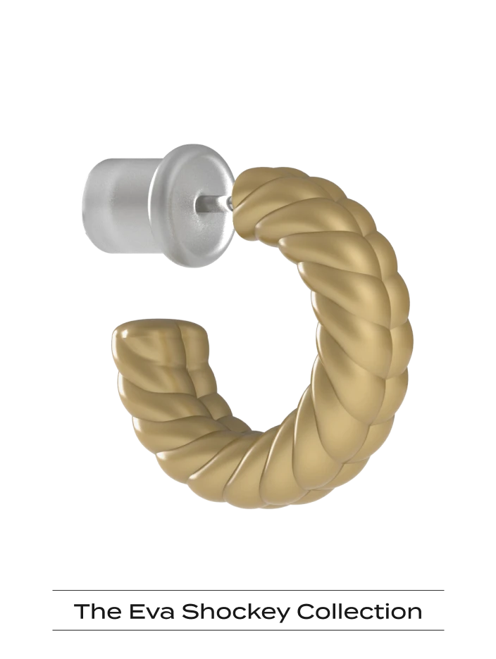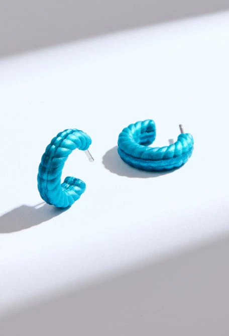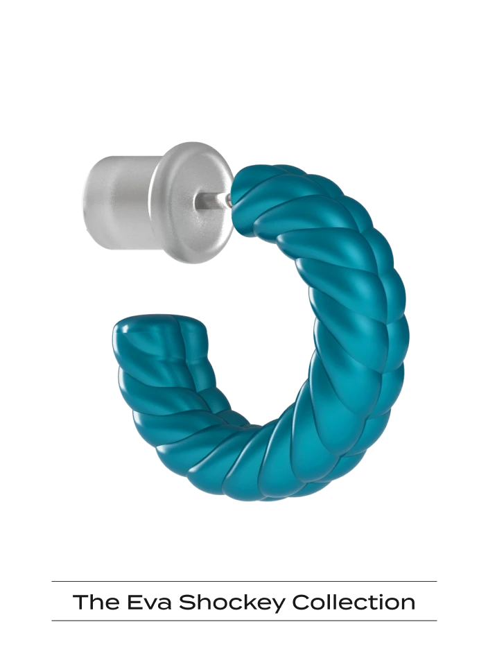 This braided semi-hoop design is available in two colors chosen by Eva: gold, and peacock blue.