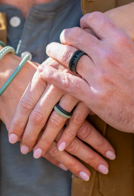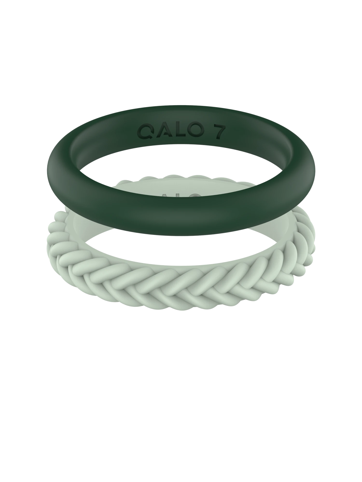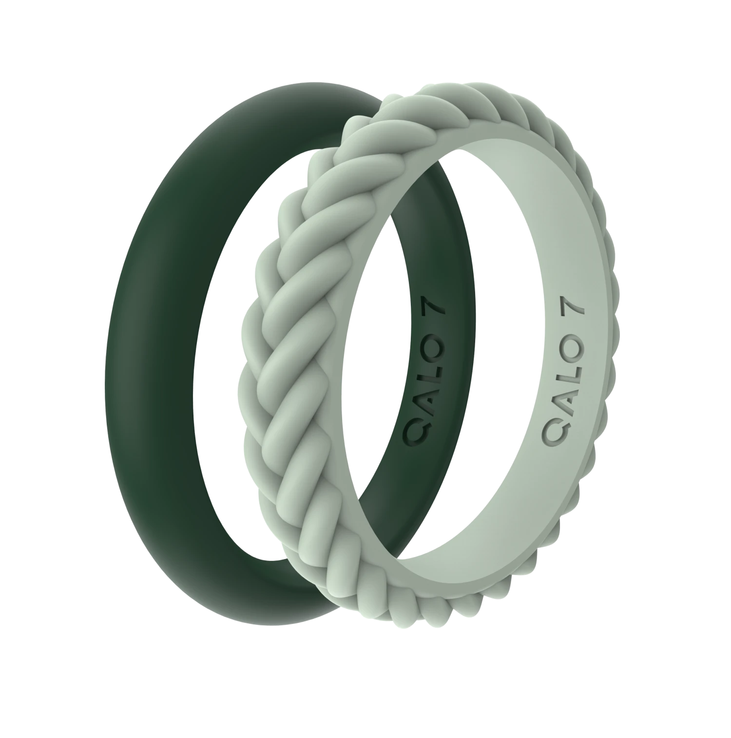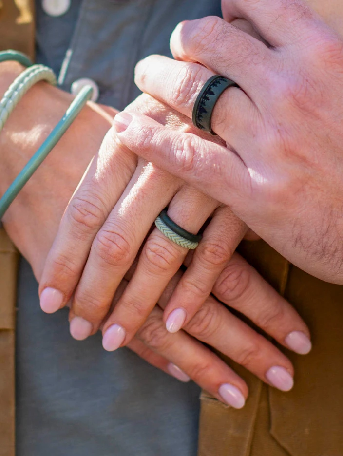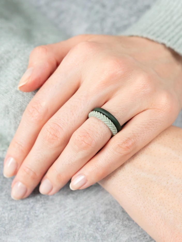 This set includes two stackable silicone rings: one smooth silhouette, and one braided.