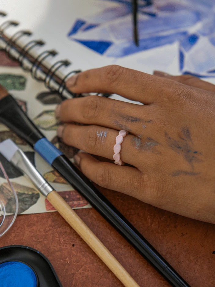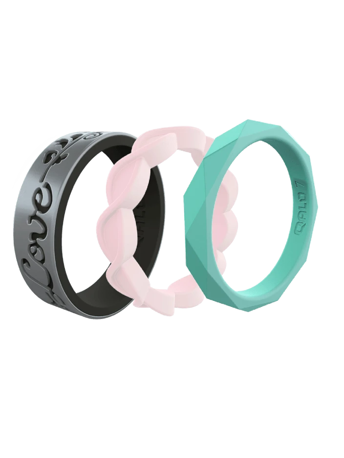 This silicone ring gift set includes a Women’s Silver and Black Filigree Love Strata, Pastel Pink Eternity, Pacic Opal Geo Stackable Silicone Rings