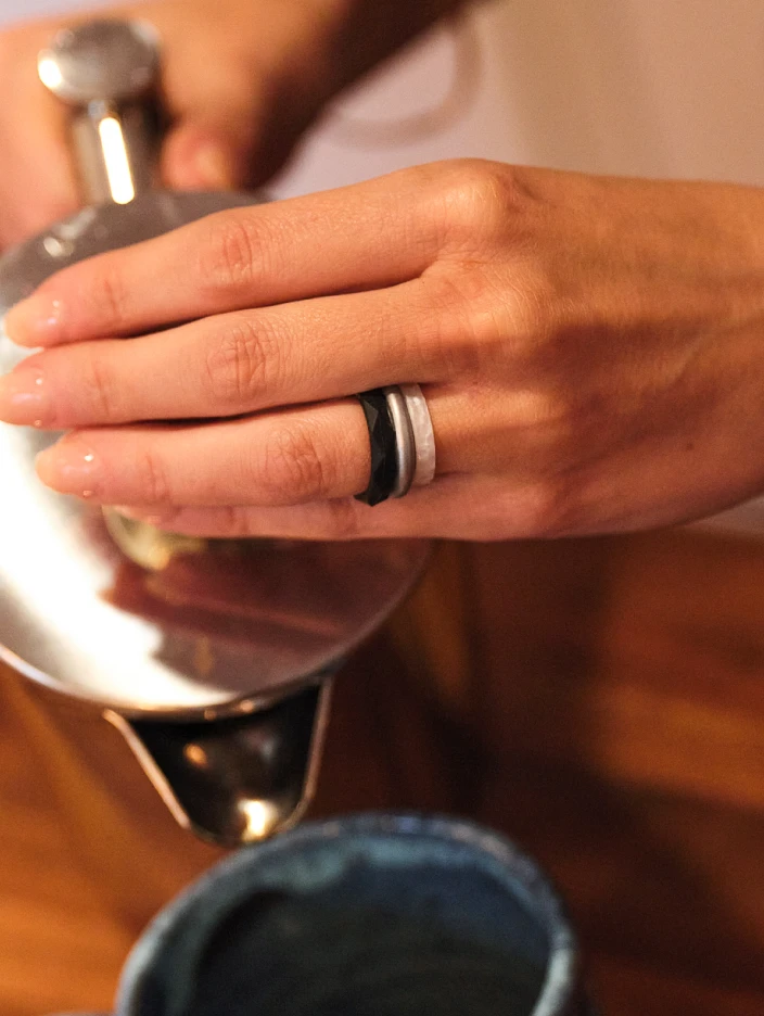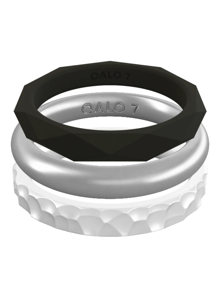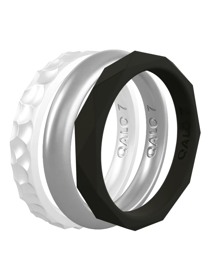 This stackable set includes the Pearl Metallic Forged Stackable, Silver Metallic Classic Stackable, and Black Geo Stackable.