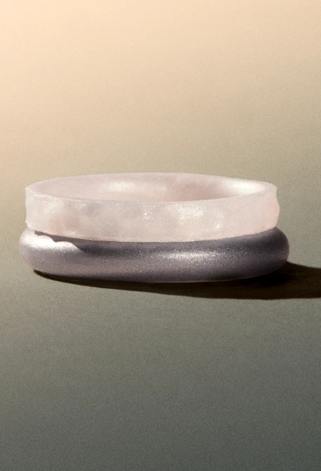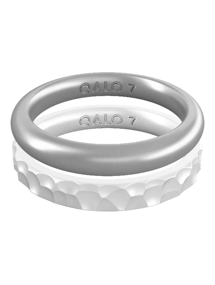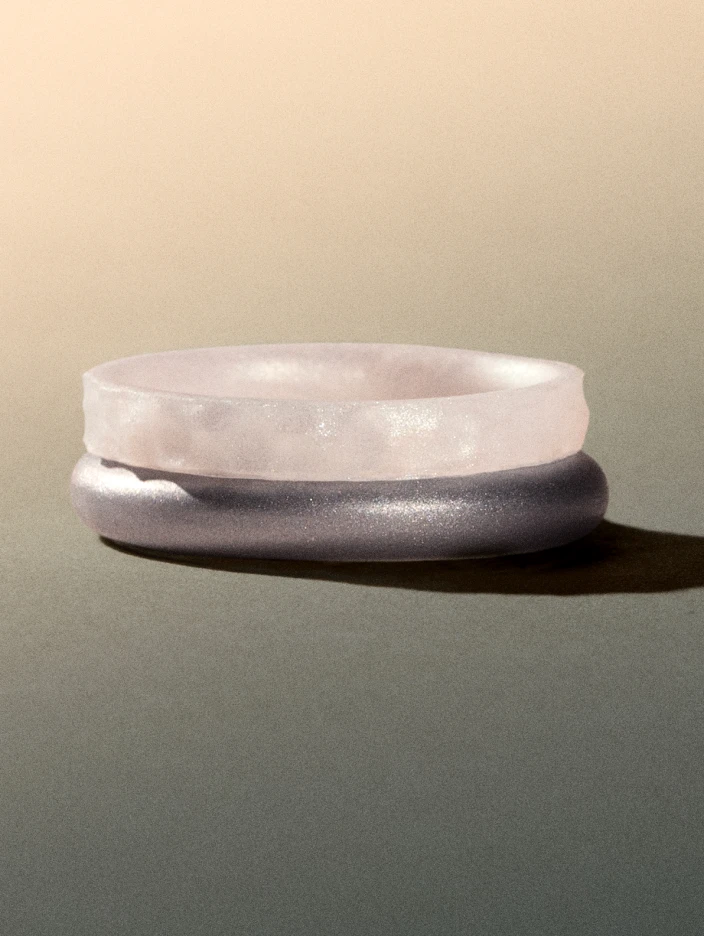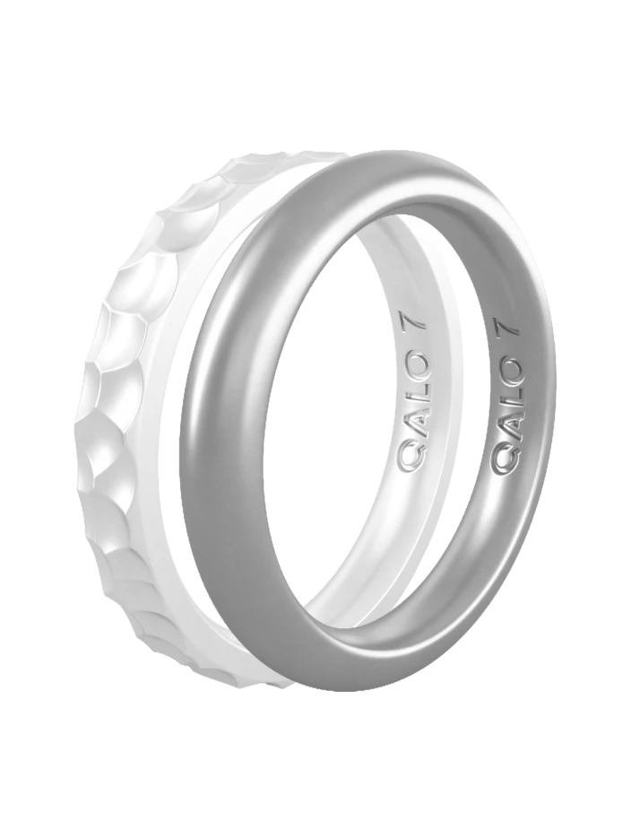 This stackable set includes the Pearl Metallic Forged Stackable and Silver Metallic Classic Stackable.