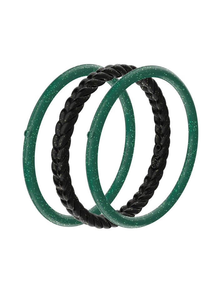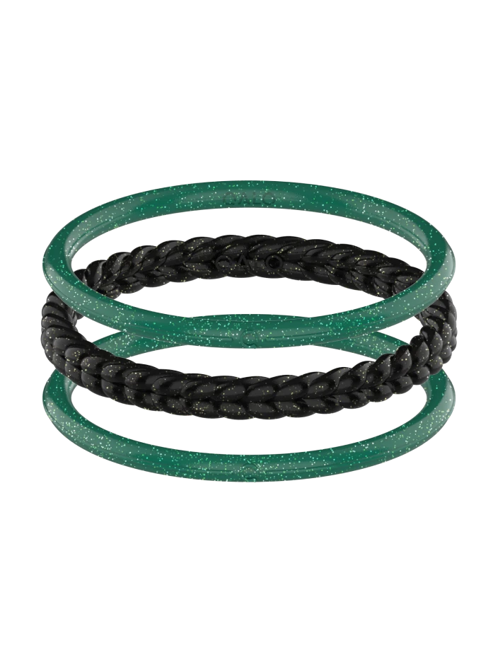 This set of three includes two smooth bangles in a shimmering emerald and one braided silhouette in a subtly sparkling onyx.