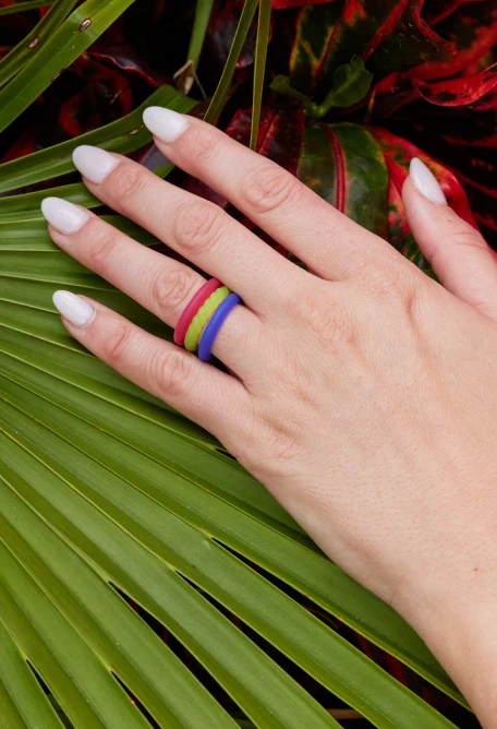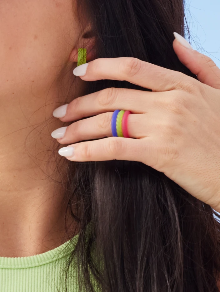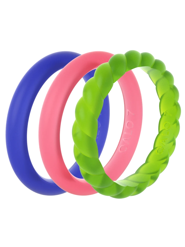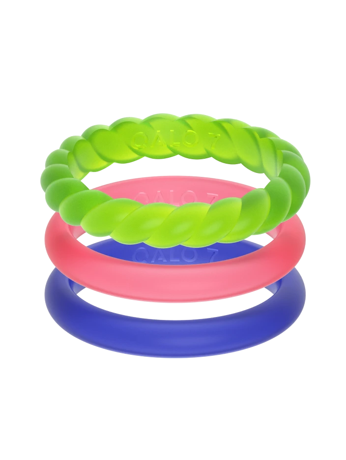 This triple stack includes two smooth silhouettes in translucent blue and pink, and one twisted silhouette in translucent lime green